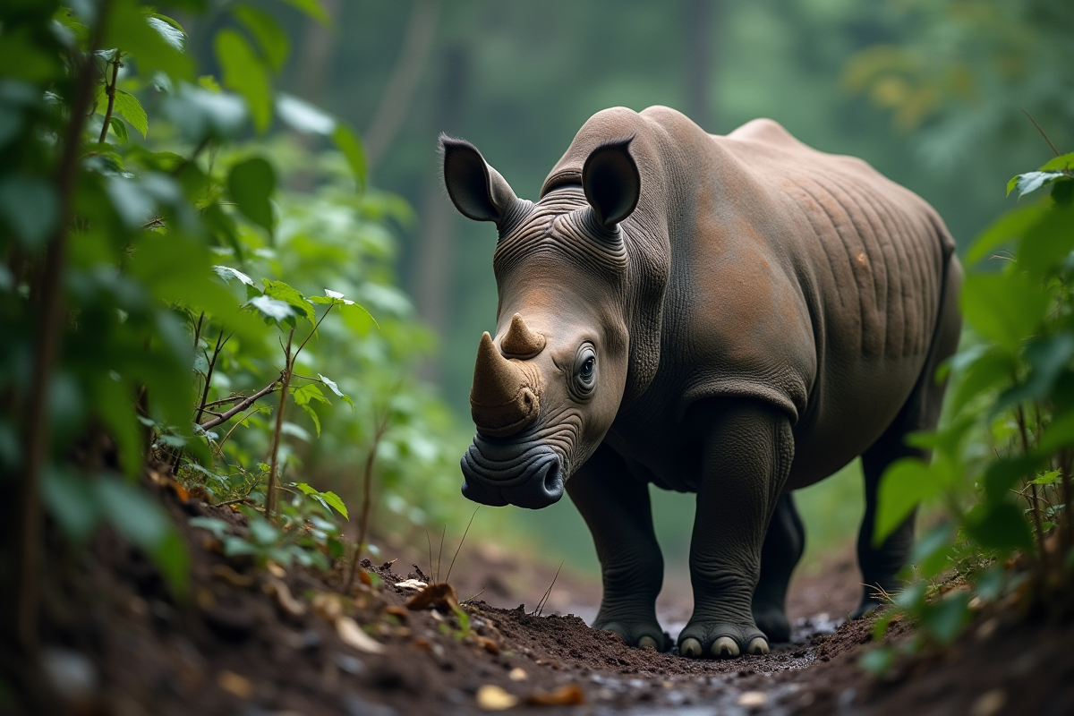 Jeune rhinoceros de Java dans la forêt humide