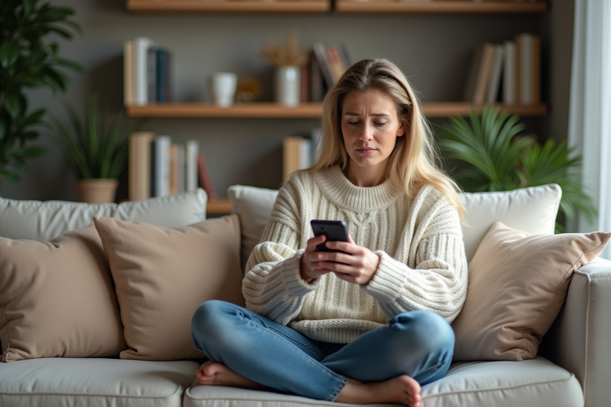 Femme assise sur un canapé moderne regardant son téléphone