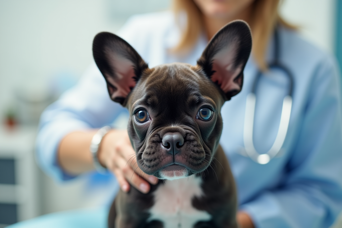 Chiot bulldog francais examine par un veterinaire dans une clinique lumineuse